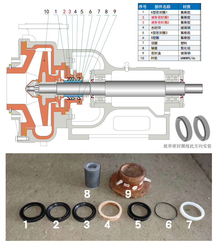 但是跟據(jù)長期的使用經(jīng)驗(yàn)發(fā)現(xiàn),當(dāng)物料有沉淀、或泵使用一定的周期后密封和軸套的面由于磨損而變松,此時(shí)極易產(chǎn)生泄漏。在此問題上,宙斯泵業(yè)經(jīng)過研究改良出一種能延長使用壽命的密封,并申報(bào)了專利,以上安裝圖供裝配時(shí)參考使用。經(jīng)過一年多來在上百家客戶中的試用發(fā)現(xiàn),更換兩只波形密封圈后的動(dòng)力密封,密封使用壽命可延長50%以上,并且不需要增加零配件成本。