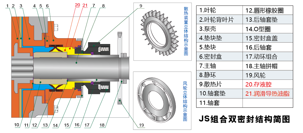 動力密封在前擋砂,起到密封砂漿的作用,機械密封在后密封存液腔(20)中的存液(清液或油脂),存液腔中的存液起到潤滑機封的動靜環和軸套與唇形橡膠密封圈的作用。與此同時,又起到傳遞熱能的作用,即密封部位的熱量傳導到密封外側的散熱裝置(9)上。散熱裝置包括散熱片,風輪的功能是在泵機運轉時把密封部位的熱量散布出去,保證軸密封安全運行。