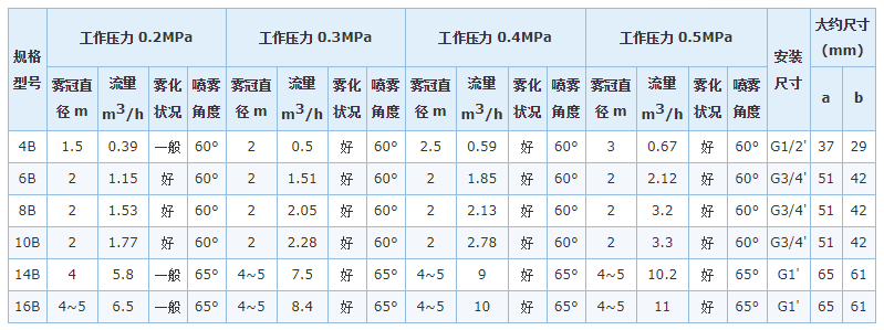 B型噴嘴產生實心錐形噴霧形狀,噴流角度為60°。這種噴嘴可在絕大多數管道系統上安裝或更新。在0.3MPa壓強下,流率從0.5至8.4m3/h。